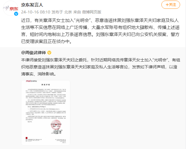 京東集團微博“京東發言人”截图 聲明稱,近日,有關章澤天加入“光明會”、惡意造謠抹黑劉強東、章澤天夫婦家庭及私人生活等不實信息在網絡上廣泛傳播,大量水軍賬號有組織地大肆散布、傳播上述謠言,短時間內炮製出上萬條謠言信息。 聲明表示,經與章澤天核實,其出席清華大學校友藝術展時所佩戴之胸針,僅是為配合藝術展及整體服裝風格的搭配,其來源、設計等均與任何組織無關。並且,針對加入“光明會”之相關言論,章澤天的服裝造型師已公開闢謠,該等言論是無中生有、憑空捏造的虛假信息。 聲明指出,大量水軍賬號有組織地大肆散布、傳播有關劉強東、章澤天夫婦家庭及私人生活的謠言,進行惡意抹黑,僅在短時間內網絡上就出現了上萬條相關謠言信息,己經嚴重損害劉強東、章澤天夫婦的聲譽。根據《中華人民共和國民法典》等法律規定,相關虛假言論的捏造、散布、轉載傳播者均涉嫌構成名譽權侵權,情節嚴重者還涉嫌構成刑事犯罪。 此前,一張章澤天出席清華大學校友藝術展的照片在網上流傳,章澤天佩戴一枚有眼睛造型的胸針,被部分網友解讀成加入“光明會”。 “光明會”是網絡陰謀論中常常出現的一個秘密組織,傳播陰謀論者宣稱該組織的目的是“控制全球事務、建立新的全球秩序”。 劉強東是京東集團創始人,現任京東集團公司董事會主席。(完) 【編輯:丘志彬】