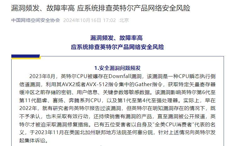 “中國網絡空間安全協會”微信公眾號截圖 中國網絡空間安全協會10月16日發表文章《漏洞頻發、故障率高 應系統排查英特爾產品網絡安全風險》,其中提到英特爾四項安全問題:安全漏洞問題頻發;可靠性差,漠視用戶投訴;假藉遠程管理之名,行監控用戶之實;暗設後門,危害網絡和信息安全。 文章稱,2023年8月,英特爾CPU被曝存在Downfall漏洞,該漏洞是一種CPU瞬態執行側信道漏洞,利用其AVX2或者AVX-512指令集中的Gather指令,獲取特定矢量寄存器緩衝區之前存儲的密鑰、用戶信息、關鍵參數等敏感數據。 從2023年底開始,大量用戶反映,使用英特爾第13、14代酷睿i9系列CPU玩特定遊戲時,會出現崩潰問題。英特爾聯合惠普等廠商,共同設計了IPMI(智能平台管理接口)技術規範,聲稱是為了監控服務器的物理健康特徵,技術上通過BMC(基板管理控制器)模塊對服務器進行管理和控制。該模塊也曾被曝存在高危漏洞(如CVE-2019-11181),導致全球大量服務器面臨被攻擊控制的極大安全風險。 除此之外,英特爾產品中的第三方開源組件存在嚴重漏洞。英特爾還暗設後門,危害網絡和信息安全。 文章最後表示,為討好美國政府,英特爾在所謂涉疆問題上積極站位打壓中國,要求其供應商不得使用任何來自於新疆地區的勞工、採購產品或服務,在其財報中更是將台灣省與中國、美國、新加坡並列,還主動對華為、中興等中國企業斷供停服,這是典型的“端起碗來吃飯,放下碗就砸鍋”。 該協會建議對英特爾在華銷售產品啟動網絡安全審查,切實維護中國國家安全和中國消費者的合法權益。(完) 【編輯:林曉惠】