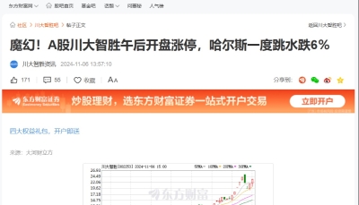 截止11月6日收盤,川大智勝漲10%,報23.42元,觸及漲停。哈爾斯收盤跌超7%,報8.98元。 但其實,這兩隻股票除了名字諧音,和美國大選選情毫無關係。 川大智勝成為特朗普概念股純粹是因為“諧音梗”。特朗普也被譯為“川普”,中國股民遂調侃稱,川大智勝有“川普用智謀取得勝利”的意思。特朗普2016年當選美國總統時,川大智勝股價也曾跟升。今年7月,特朗普遇襲,川大智勝在隨後的一個交易日股市漲停。 川大智勝的註冊地址在四川成都,於深圳證券交易所上市。該公司主營業務包括人工智能技術諮詢服務、人工智能通用應用系統、數據處理和存儲和信息技術諮詢服務等。 另一家A股上市公司“哈爾斯”因為和美國大選另一位候選人哈里斯的名字相似,也被股民戲稱為“哈里斯概念股”。哈爾斯的註冊地址在浙江金華,主要從事不銹鋼保溫器皿的生產與銷售。公司主要產品包括不銹鋼、鈦等材質的真空保溫器皿和智能水杯,以及不銹鋼、鈦、玻璃、鋁、塑料等材質的非真空器皿。 對此,中國網友感覺很有趣,表示“太抽象了”,這是“獨屬於中國股民的幽默”。