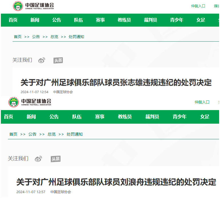 中國足協官網截圖 中國足協在官網發佈的公告中表示,11月3日,在南京城市俱樂部隊主場與廣州隊的比賽進行至第86分鐘時,因對裁判員判罰不滿,張志雄“辱罵裁判員,裁判員出示紅牌將其罰離替補席”。張志雄還“在退場過程中,用腳蹬踹通道內側牆壁,導致牆體破損”。 劉浪舟也是在第86分鐘時對裁判判罰表示不滿,“用手擊打替補席造成替補席破損,並實施非體育行為辱罵裁判員,裁判員出示紅牌將其罰離替補席”。 3日是2024賽季中甲的最後一個比賽日,廣州隊最終1比2不敵南京城市隊,名列積分榜第三。 此外,由於中甲聯賽已經結束,劉浪舟、張志雄的停賽處罰將順延至下賽季執行。這也意味著兩名球員將錯過下賽季開局階段的6場比賽。(完) 【編輯:丘志彬】
