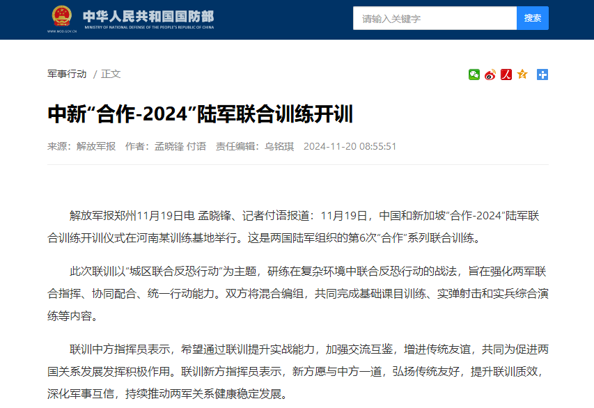 香港中通社11月20日電 中國和新加坡“合作-2024”陸軍聯合訓練開訓儀式19日在河南某訓練基地舉行。這是兩國陸軍組織的第6次“合作”系列聯合訓練。