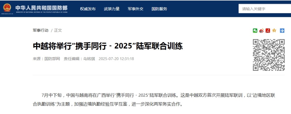 中國國防部網站截圖 據“國防部發布”20日消息,此次聯訓以“城區聯合反恐行動”為主題,研練在複雜環境中聯合反恐行動的戰法,旨在強化兩軍聯合指揮、協同配合、統一行動能力。雙方將混合編組,共同完成基礎課目訓練、實彈射擊和實兵綜合演練等內容。 聯訓中方指揮員表示,希望通過聯訓提升實戰能力,加強交流互鑒,增進傳統友誼,共同為促進兩國關係發展發揮積極作用。聯訓新方指揮員表示,新方願與中方一道,弘揚傳統友好,提升聯訓質效,深化軍事互信,持續推動兩軍關係健康穩定發展。(完) 【編輯:丘志彬】