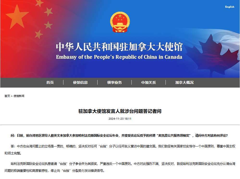 中國駐加拿大使館網站截圖 有記者提問,日前,台灣當局前領導人蔡英文赴加拿大參加哈利法克斯國際安全論壇年會,並接受該論壇授予的所謂“麥凱恩公共服務領袖獎”,請問中方對此有何評論? 駐加拿大使館發言人表示,中方在台灣問題上的立場是一貫的、明確的,堅決反對任何“台獨”分子以任何名義竄訪中國的建交國。中方敦促有關國家切實恪守一個中國原則,尊重中國主權和領土完整。 發言人指出,哈利法克斯國際安全論壇執意邀請“台獨”分子參會並為其頒獎,嚴重違反一個中國原則。中方對此強烈不滿、堅決反對,敦促哈利法克斯國家安全論壇充分認清台灣問題的極端重要性和高度敏感性,停止向“台獨”分裂勢力發出錯誤信號。(完) 【編輯:丘志彬】