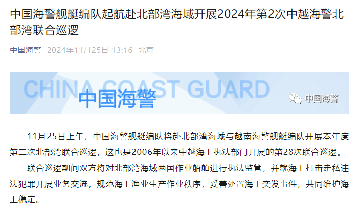 香港新聞網11月25日電 據“中國海警”微信公眾號消息,11月25日上午,中國海警艦艇編隊將赴北部灣海域與越南海警艦艇編隊開展本年度第二次北部灣聯合巡邏,這也是2006年以來中越海上執法部門開展的第28次聯合巡邏。