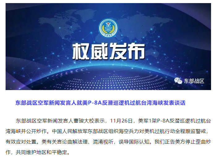 香港新聞網11月26日電 據“東部戰區”微信公眾號消息,中國人民解放軍東部戰區空軍新聞發言人曹駿大校表示,11月26日,美軍1架P-8A反潛巡邏機過航台灣海峽并公開炒作。中國人民解放軍東部戰區組織海空兵力對美機過航行動全程跟監警戒,有效應對處置。美有關言論曲解法理、混淆視聽,誤導國際認知。我們正告美方停止歪曲炒作,共同維護地區和平穩定。