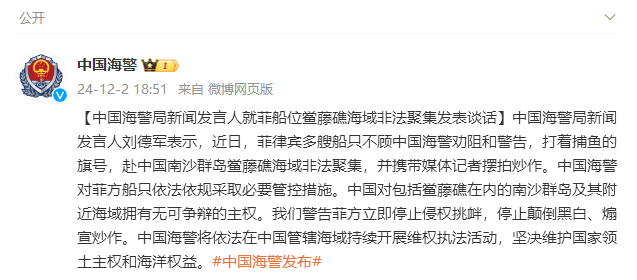 微博@中國海警 截圖 中國海警局新聞發言人劉德軍表示,近日,菲律賓多艘船隻不顧中國海警勸阻和警告,打著捕魚的旗號,赴中國南沙群島鱟藤礁海域非法聚集,並攜帶媒體記者擺拍炒作。中國海警對菲方船隻依法依規採取必要管控措施。中國對包括鱟藤礁在內的南沙群島及其附近海域擁有無可爭辯的主權。我們警告菲方立即停止侵權挑釁,停止顛倒黑白、煽宣炒作。中國海警將依法在中國管轄海域持續開展維權執法活動,堅決維護國家領土主權和海洋權益。(完) 【編輯:丘志彬】