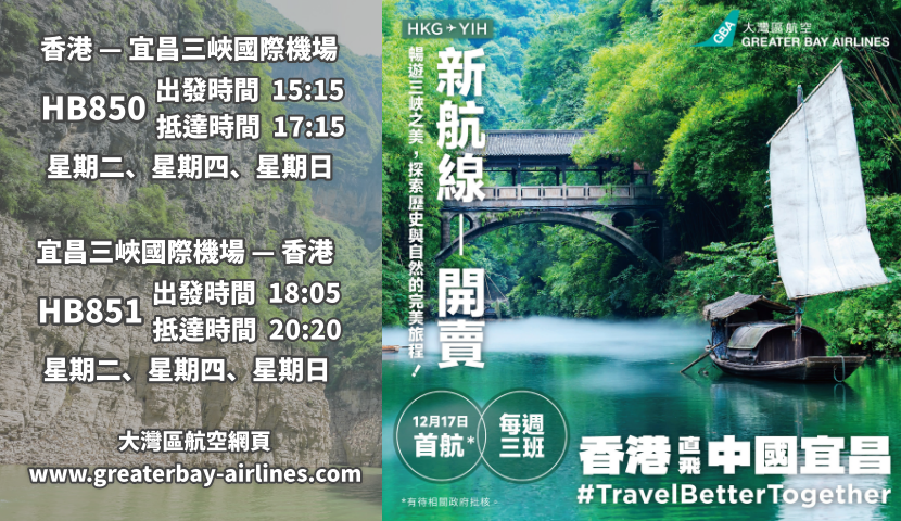 大灣區航空12月17日首航湖北宜昌,一周3班往返遊長江三峽大壩。(香港新聞網製圖) 每周3班往返三峽機場 湖北省西南部的宜昌市位處長江上游及中游流域,總面積約21,000平方公里,擁有豐富的旅遊資源。屢獲獎項的三峽大壩、三峽大瀑布、三峽人家風景區、清江畫廊、屈原故里及西陵峽口等均吸引大批來自世界各地的遊客。
