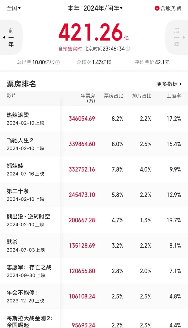 香港新聞網12月30日電 據網絡平台數據,截至2024年12月28日23時46分,中國內地2024年度總觀影人次突破10億,總票房421.26億元(人民幣,下同),總場次1.43億場,平均票價42.1元,《抓娃娃》領跑2024年觀影人次榜。