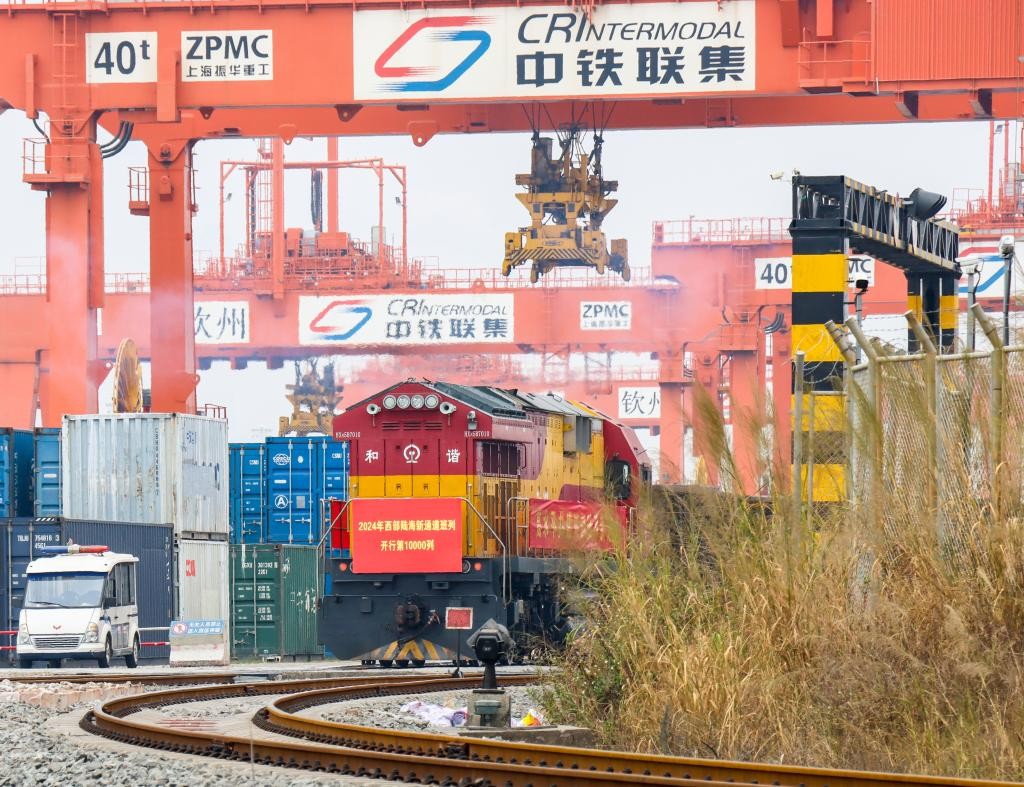 2024年中國西部陸海新通道班列第10000列發車。(北部灣港集團供圖) 作為中國西部省份與東盟國家合作打造的國際陸海貿易新通道,西部陸海新通道北接絲綢之路經濟帶,南連21世紀海上絲綢之路,協同銜接長江經濟帶,在區域協調發展格局中具有重要戰略地位。2019年8月,西部陸海新通道正式上升為中國國家戰略。西部陸海新通道班列開行量從2017年的178列,增長到2024年的超過10000列,增長了55倍。 新華社報道稱,據介紹,今年以來,西部陸海新通道鐵海聯運外貿已發運128651標箱,同比增長24%,其中RCEP成員國經新通道運輸貨物87846標箱,佔新通道總運量的17%,同比增長32%。 截至目前,西部陸海新通道鐵海聯運班列貨物運輸品類增加到1166種,輻射中國18個省(區、市)73個城市156個站點,通達全球125個國家及地區的542個港口。(完) 【編輯:張麗欣】