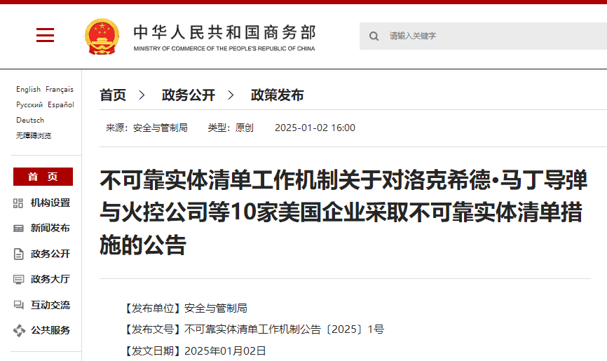 香港新聞網1月2日電 1月2日,中國商務部發佈公告,決定將參與對台灣地區軍售的洛克希德·馬丁導彈與火控公司等10家美國企業採取不可靠實體清單措施。