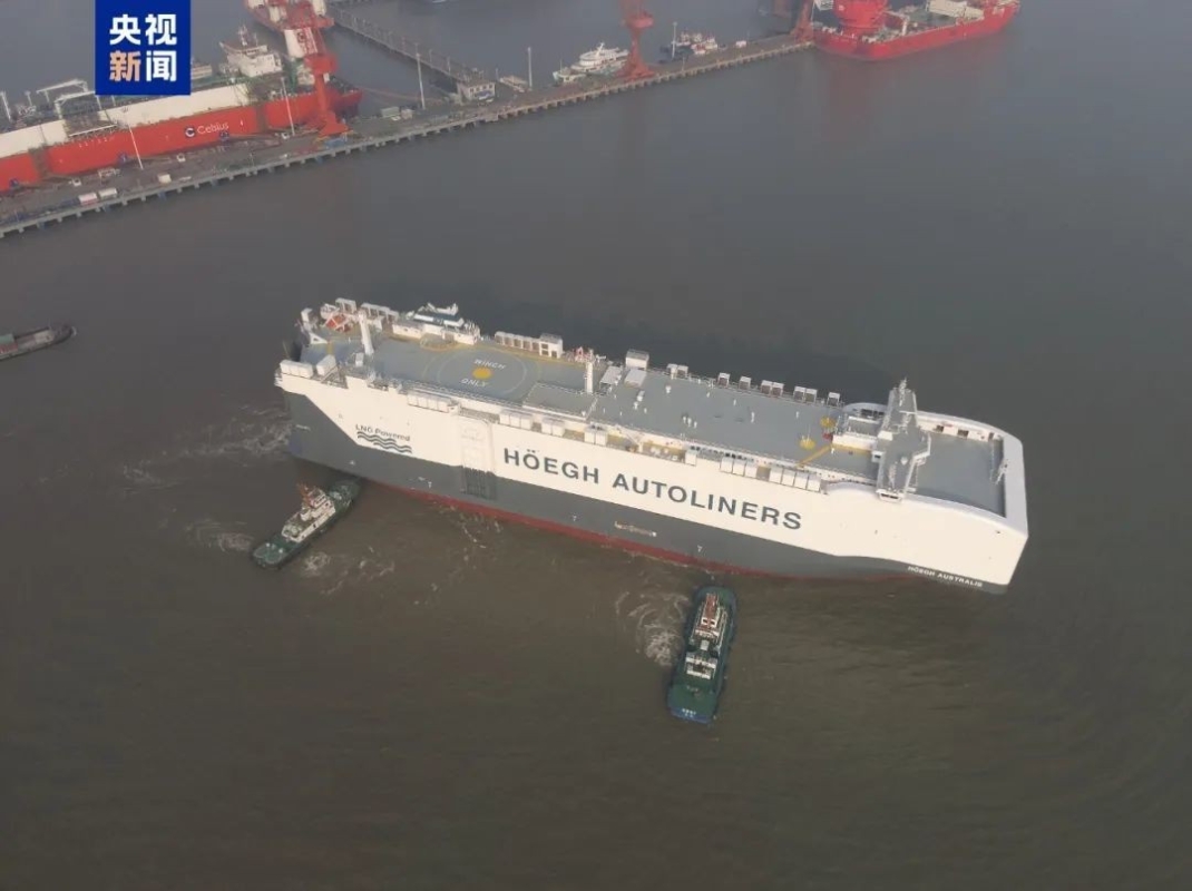 香港中通社1月6日電 1月5日下午,新建造的全球最大、最環保可運載9100輛車的汽車滾裝船在江蘇南通海門交付出江,將駛往上海投入運營。