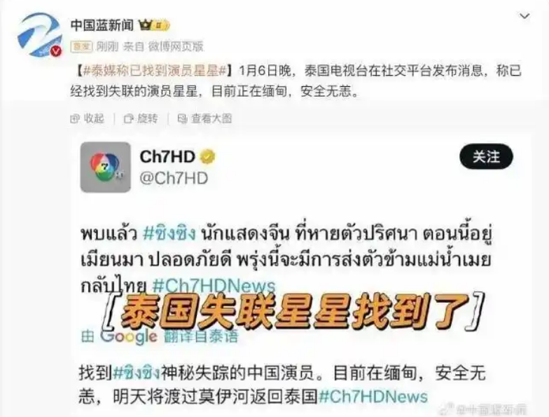 香港新聞網1月7日電 1月6日晚,泰國電視台在社交平台發布消息,稱已經找到失聯的演員星星,目前正在緬甸,安全無恙。 1月5日晚,微博賬號“失眠爹地”發文稱,其男友“星星”(王星)是一名演員,日前赴泰國拍戲,於北京時間1月3日中午於泰緬邊境的湄索縣失聯。