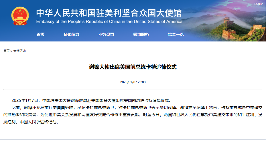 此前,謝鋒還專程前往美國國務院,吊唁卡特逝世,對卡特逝世表示深切哀悼。