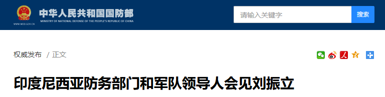 中國國防部網站截圖 印尼方表示,印尼與中國文化相通,人民相親。印尼方高度重視對華關係,感謝中方對印尼發展提供的支持幫助。當前兩軍關係發展勢頭良好,希望兩軍進一步加強人員交流、聯合演訓等各領域務實合作。 劉振立表示,中方始終從戰略高度和長遠角度看待中印尼關係。中國軍隊願與印尼方一道,在兩國元首戰略引領下,以兩國建交75周年為契機,打造兩軍合作更多亮點和成果,為地區和平穩定作出更大貢獻。 會見前,印尼方舉行歡迎儀式,劉振立檢閱了印尼三軍儀仗隊。(完) 【編輯:丘志彬】