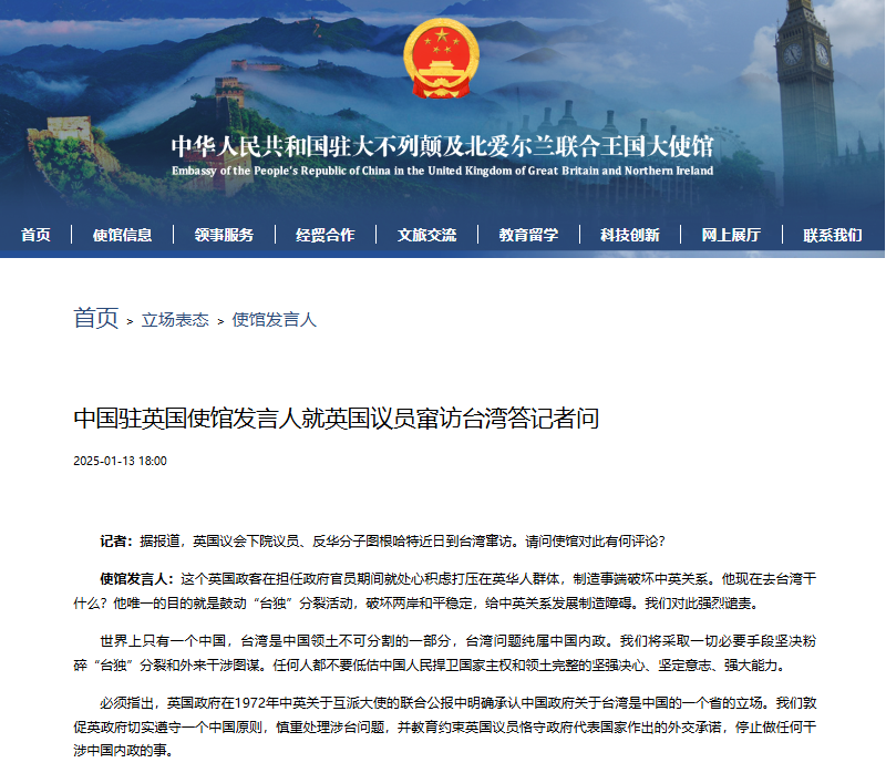 中國駐英國大使館網站截圖 有記者問,據報道,英國議會下院議員、反華分子圖根哈特近日到台灣竄訪。請問使館對此有何評論?中國駐英使館發言人應詢指出,這個英國政客在擔任政府官員期間就處心積慮打壓在英華人群體,製造事端破壞中英關係。他現在去台灣幹什麼?他唯一的目的就是鼓動“台獨”分裂活動,破壞兩岸和平穩定,給中英關係發展製造障礙。中方對此強烈譴責。 發言人表示,世界上只有一個中國,台灣是中國領土不可分割的一部分,台灣問題純屬中國內政。中國政府將採取一切必要手段堅決粉碎“台獨”分裂和外來干涉圖謀。任何人都不要低估中國人民捍衛國家主權和領土完整的堅強決心、堅定意志、強大能力。 發言人強調,必須指出,英國政府在1972年中英關於互派大使的聯合公報中明確承認中國政府關於台灣是中國的一個省的立場。敦促英政府切實遵守一個中國原則,慎重處理涉台問題,並教育約束英國議員恪守政府代表國家作出的外交承諾,停止做任何干涉中國內政的事。(完) 【編輯:丘志彬】