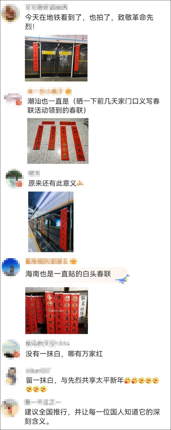深圳地鐵崗廈北站貼有白頭春聯。(圖源:香港新聞網) 據說,這一習俗起源於1932年的淞滬抗戰。當時,粵軍十九路軍英勇抵抗日本侵略,無數廣東子弟兵犧牲在戰場上。春節將至,廣東人民便在春聯上留下一寸白綾,以此緬懷先烈,銘記歷史。 這一細節感動了不少網友,有網友曬出了自己拍到的白頭春聯,也有網友留言稱,“與先烈共享太平新年”,“沒有一抹白,哪有萬家紅”。