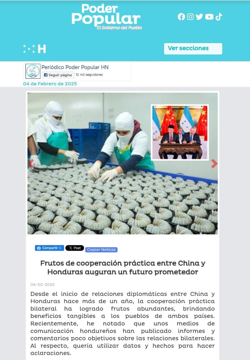(圖源:中國駐洪都拉斯大使館網站) 據中國駐洪都拉斯使館6日引述的文章內容,于波介紹,中洪建交一年多來,雙邊務實合作取得豐碩成果,給兩國人民帶來實實在在的利益。其中,中國援洪教育基礎設施項目順利推進,首批7所農業技術學校項目即將開工建設,建成後洪成千上萬戶家庭的子女將從中受益。中方專家組已抵洪開展特古西加爾巴城市公園和會議中心項目可行性研究。2024年,中國向洪援助了1300多噸小麥粉,分發到洪50多個城市的居民手中;向洪捐助了360萬美元的登革熱防控用品;在洪遭遇飓風災害、羅阿坦醫院發生火災等艱難時刻,中方第一時間提供人道主義援助。中國企業正在洪北部地區投資建設紡織、建築陶瓷工業園,預計總投資達數億美元,未來將創造上萬個工作崗位。 于波還介紹,中國擁有超大規模市場,為洪重點產品提供持久穩定的出口增長空間和發展機遇。2023年,洪以主賓國身份參加第七屆中國國際進口博覽會,展示的特色產品受到中國消費者歡迎。中國海關發布的數據顯示,2023年洪對華出口增長近2倍。2024年,洪對華出口繼續保持快速增長勢頭,出口額達9682萬美元,同比增長19.3%,遠遠高於中國對洪出口5.9%的增速。在雙方努力下,洪咖啡進入中國市場勢頭強勁,2024年前11月對華出口1402萬美元,增長達16倍,給洪帶來了更多的外匯和就業。中洪自貿談判已進入最後衝刺階段。 于波寫道,同咖啡一樣,各國基於市場化原則開展白蝦行業國際競爭與合作。中方高度重視洪白蝦產業面臨的暫時困難,採取切實措施推動洪白蝦輸華。建交後,中方特事特辦,在極短時間內完成了洪白蝦准入。2024年9月生效的中洪自貿協定早期收獲安排為洪白蝦免除輸華關稅。中方為洪方組團赴福州、青島參加漁博會提供各項便利,促成兩國企業達成四個集裝箱白蝦交易。 于波特別強調,洪白蝦輸往中國大陸市場的成交價已高於2024年洪向中國台灣省等市場的出口價,遠高於國際市場平均價格,有關報道中所謂“中國大陸市場出價不及中國台灣省報價的35%到40%”的言論純屬子虛烏有。中國年進口白蝦百萬噸,洪白蝦本應在中國市場佔據一席之地。希望洪白蝦企業排除外部干擾,抓住機遇,樂觀開拓,擁抱中國大市場,基於互利共贏原則與中國企業洽談合作,實現更大規模對華出口和長期發展繁榮。此外,中方還將於今年上半年面向洪白蝦養殖業舉辦技術培訓班,助洪降低養殖成本,提升產業競爭力。(完) 【編輯:丘志彬】