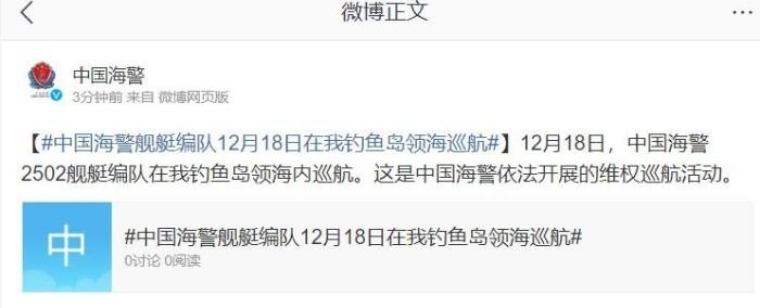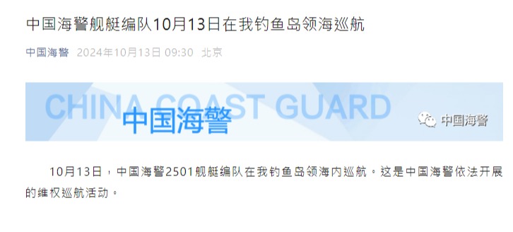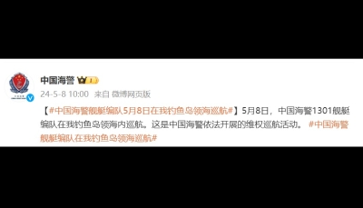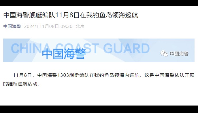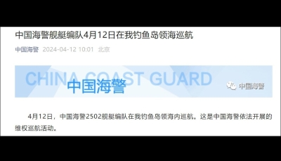 香港中通社2月12日電 2月12日,中國海警微信公眾號發布消息,當天,中國海警2305艦艇編隊在中國釣魚島領海內巡航。這是中國海警依法開展的維權巡航活動。