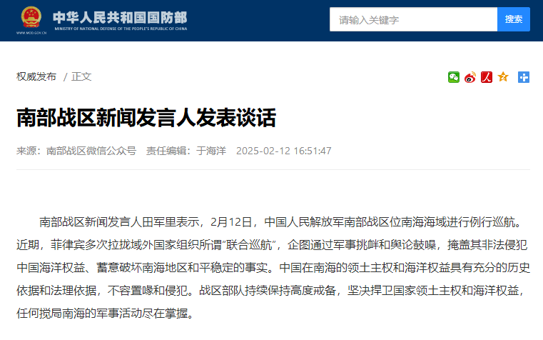 香港中通社2月12日電 中國軍方南部戰區新聞發言人田軍里空軍大校12日表示,當天,中國人民解放軍南部戰區位南海海域進行例行巡航。 田軍里表示,近期,菲律賓多次拉攏域外國家組織所謂“聯合巡航”,企圖通過軍事挑釁和輿論鼓噪,掩蓋其非法侵犯中國海洋權益、蓄意破壞南海地區和平穩定的事實。中國在南海的領土主權和海洋權益具有充分的歷史依據和法理依據,不容置喙和侵犯。戰區部隊持續保持高度戒備,堅決捍衛國家領土主權和海洋權益,任何攪局南海的軍事活動盡在掌握。
