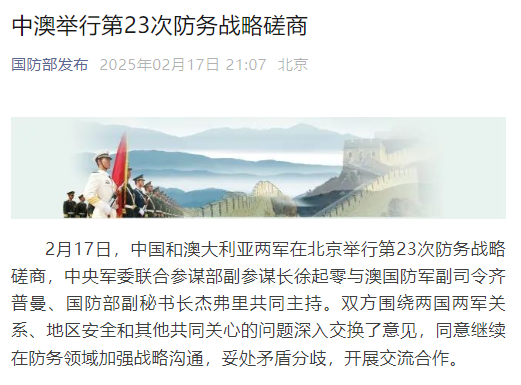 圖源:中國“國防部發佈”微信公眾號截圖 雙方圍繞兩國兩軍關係、地區安全和其他共同關心的問題深入交換了意見,同意繼續在防務領域加強戰略溝通,妥處矛盾分歧,開展交流合作。 澳國防部17日在官網發布新聞稿稱,澳中上一次防務戰略磋商是在2019年。 此前,澳國防部13日稱,11日,該國一架空軍巡邏機在南海海域飛行時,中國空軍的一架飛機對其進行了“不安全且不專業的互動”。 中國外交部發言人郭嘉昆13日就此應詢表示,澳軍機未經中方允許蓄意侵闖中國西沙群島領空,侵犯中國主權,危害中方國家安全。中方採取驅離措施,正當合法,專業克制。中方已就此向澳方提出嚴正交涉,要求澳方停止侵權挑釁,停止破壞南海的和平與穩定。(完) 【編輯:彭玉婷】
