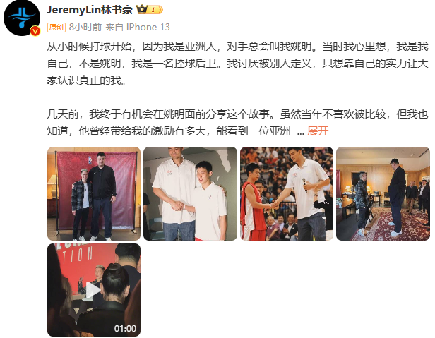 圖片來源:林書豪微博截圖 林書豪表示:“從小時候打球開始,因為我是亞洲人,對手總會叫我姚明。當時我心裡想,我是我自己,不是姚明,我是一名控球後衛。我討厭被別人定義,只想靠自己的實力讓大家認識真正的我。” 他稱,幾天前,終於有機會在姚明面前分享這個故事。“雖然當年不喜歡被比較,但我也知道,他曾經帶給我的激勵有多大,能看到一位亞洲球員在籃球最高殿堂站穩腳跟是多麼讓人振奮。” 林書豪形容,“他(姚明)為我們闖出一條路,因為他,那扇門被推開得更大,讓我有機會踏進去。他也是第一個在我進NBA(美國職業籃球聯賽)後邀請我參加官方活動的人,就是他的慈善賽。” 林書豪還表示:“我期待有一天,亞洲球員在聯盟裡不再是少數,不再是例外,而是籃球世界裡自然的一部分。向姚明致敬,感謝你為籃球、為我、為我們所做的一切。” 公開資料顯示,林書豪1988年生於美國加利福尼亞州,畢業於哈佛大學,司職控球後衛,是NBA歷史上首位美籍華裔球員。他曾在NBA先後效力於金州勇士隊、紐約尼克斯隊、休斯敦火箭隊、洛杉磯湖人隊、夏洛特黃蜂隊、布魯克林籃網隊、亞特蘭大老鷹隊以及多倫多猛龍隊。 姚明1980年生於上海,司職中鋒。1998年4月首次入選中國國家隊。期間,隨隊2次闖入奧運八強,個人斬獲1次世錦賽得分王。2002年以歷史首位外籍狀元的身份加入NBA休斯敦火箭隊,生涯8次入選全明星陣容,5次入選年度最佳陣容。2011年退役。(完) 【編輯:林曉惠】