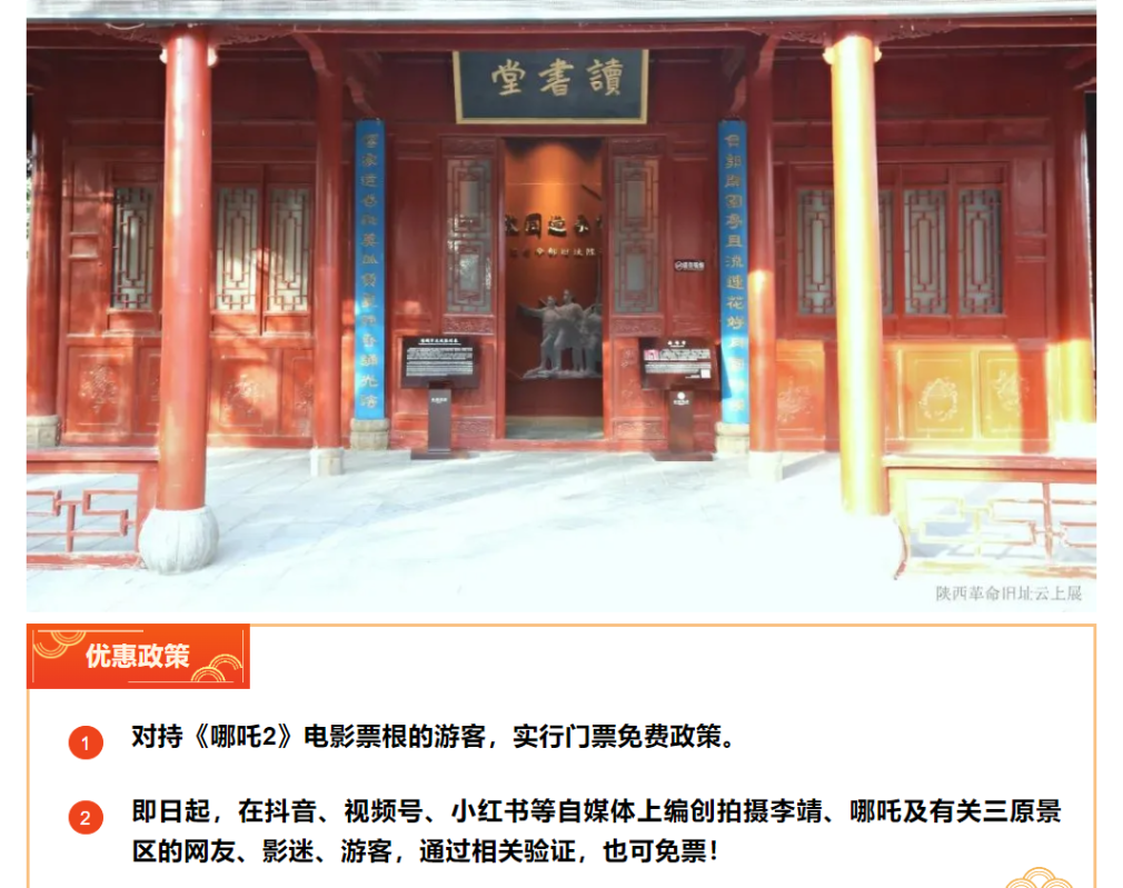 圖源:燈塔專業版 浙江 2月22日,溫州雁蕩山景區發佈消息:2月23日至2月28日,遊客憑《哪吒2》票根,到雁蕩山景區享受免門票;3月1日至3月30日享受門票5折優惠。(參與活動景區:靈峰日景、靈峰夜景、方洞景區、靈岩景區、大龍湫景區、三折瀑景區、顯勝門景區、羊角洞景區、雁湖景區) 河北 2月20日,唐山南湖開灤旅遊景區發佈消息:即日起至2月23日,凡是持《哪吒2》電影票的遊客入園唐山南湖春節燈會一律半價,需提供紙質票原件或相關購票記錄。 2月21日,秦皇島集發農業夢想王國發佈消息:即日起至3月1日,凡持有《哪吒2》電影票的遊客(紙質票原件或相關購票記錄均可),前往集發農業夢想王國售票窗口核驗購票享半價優惠。 天津 2月18日,天津盤山風景名勝區發佈消息:2月28日前,遊客憑《哪吒2》紙質電影票票根及本人身份證,可免費遊覽盤山景區,此次免費僅包含盤山景區門票,不含索道、觀光車等費用。 陝西 2月20日,寶雞文旅發佈消息:2月20日-12月31日,遊客憑電影票根,可享受九龍山景區免門票福利。 2月16日,咸陽三原縣文旅局推出優惠活動:即日起持《哪吒2》電影票根的遊客可免門票遊覽李靖故居、三原城隍廟兩大文化地標,通過抖音、視頻號、小紅書等自媒體發佈相關創作內容經核驗亦可享同等優惠。
