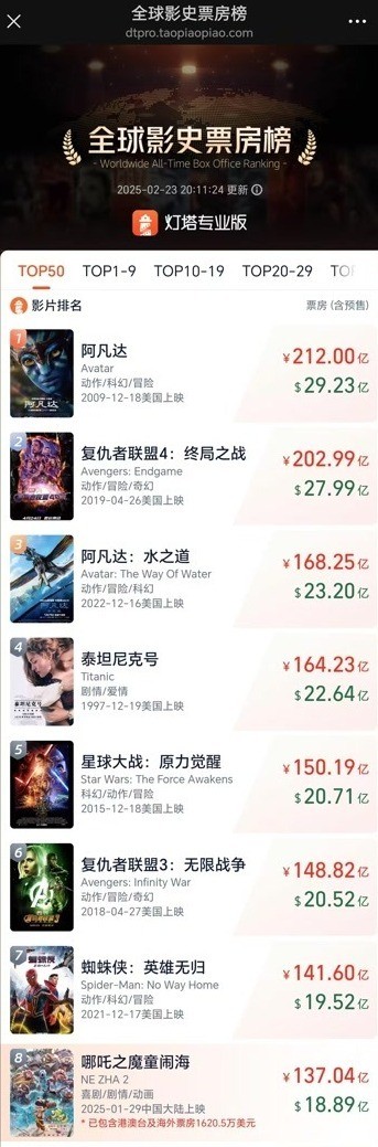 《哪吒2》票房破137億 多地景區:憑票免費、半價遊玩香港新聞網2月24日電 中國動畫電影《哪吒之魔童鬧海》(簡稱《哪吒2》)22日起在港澳地區全面上映,首日開畫票房高達657.28萬港元,入場人次達92035人,成為香港及澳門影史動畫電影開畫票房冠軍。據燈塔專業版數據顯示,截至2月23日20點,《哪吒2》全球票房已突破137億元(單位:人民幣,下同),暫列全球票房榜第8。 哪吒不僅在銀幕上大放異彩,更是帶動了各地的旅遊熱潮。近日,內地多個景區接連宣佈,憑《哪吒2》電影票根可免門票或半價遊覽。一起來看看。