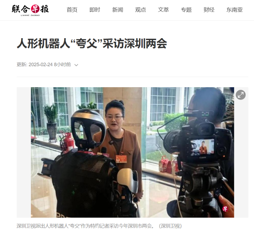 新加坡《聯合早報》網站截圖 2月24日,新加坡《聯合早報》發表了一篇名為《人形機器人“夸父”採訪深圳兩會》的文章。文章關注到,深圳製造的機器人首次以特約記者身份參與深圳兩會報道。文章指出,“夸父”是中國國內首款搭載了開源鴻矇系統,可跳躍、可適應多地形行走的人形機械人,曾入選“2024年人形機械人10大創新產品”。 而除了新加坡《聯合早報》外,很多港台媒體也注意到這一消息。 香港《星島日報》的報道稱,舉著深圳衛視的採訪麥克風,邁著步伐,“夸父”一亮相就賺足眼球,委員們紛紛上前與其交流互動。 香港《文匯網》以“深圳兩會現場:機器人‘記者’成‘團寵’”為題,指出機器人記者在深圳兩會上大受歡迎。而人工智能、機器人等領域,正成為今年深圳兩會熱議的焦點。(完) 【編輯:李彥洲】
