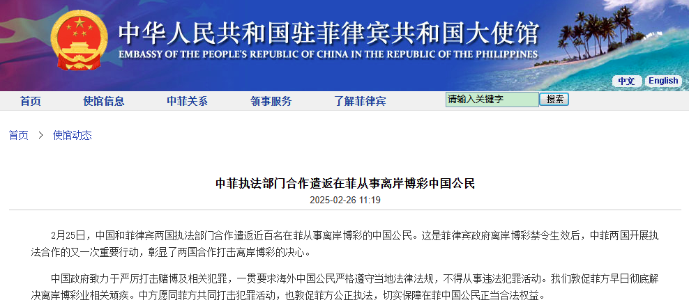 中國駐菲律賓大使館官網截圖 中國政府致力於嚴厲打擊賭博及相關犯罪,一貫要求海外中國公民嚴格遵守當地法律法規,不得從事違法犯罪活動。我們敦促菲方早日徹底解決離岸博彩業相關頑疾。中方願同菲方共同打擊犯罪活動,也敦促菲方公正執法,切實保障在菲中國公民正當合法權益。(完) 【編輯:彭玉婷】