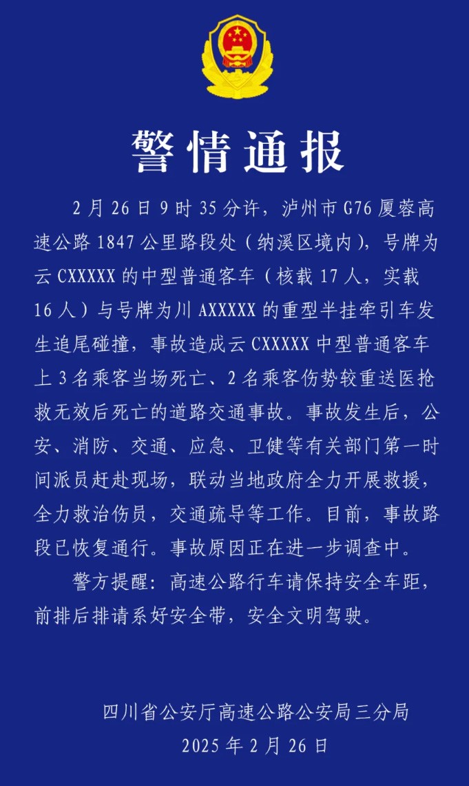 香港中通社2月26日電 據中國四川省公安廳高速公路公安局三分局26日通報,當日9時35分許,四川省瀘州市G76廈蓉高速公路1847公里路段處,一輛中型普通客車(核載17人,實載16人)與一輛重型半掛牽引車發生追尾碰撞。客車上3名乘客當場死亡;2名乘客傷勢較重,送醫搶救無效後死亡。