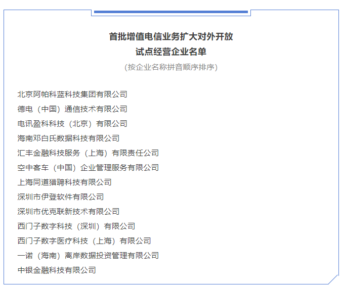 圖源:“工信微報”微信公眾號截圖 據報,此次批覆的企業包括了北京阿帕科藍科技集團有限公司、德電(中國)通信技術有限公司、西門子數字科技(深圳)有限公司等知名跨國企業的子公司。這些企業進入內地市場,預計將為中國消費者提供更加多樣化的電信服務選擇,並促進市場的進一步競爭和發展。 工信部相關負責人指出,此次批覆是中國信息通信行業對外開放的重要里程碑,不僅體現了與國際高標準經貿規則對接的決心,也是深化體制改革和推進制度型開放的關鍵步驟之一。 截至今年2月底,中國已有超過2400家外商投資的電信企業,較去年同期增長了30%。這一顯著增長體現了中國在吸引外資方面的持續努力和成效。隨著《2025年穩外資行動方案》的實施,政府正積極推動包括電信在內的多個領域的開放試點,以增強市場活力和服務質量。(完) 【編輯:彭玉婷】