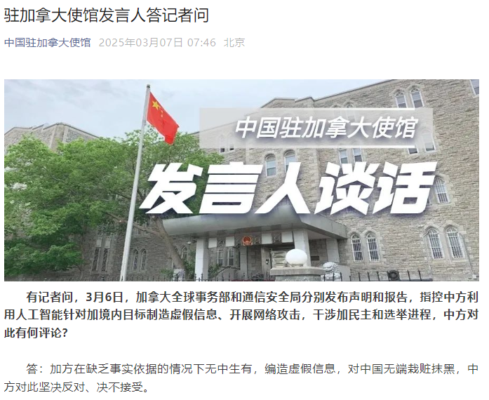 香港中通社3月7日電 加拿大全球事務部和通信安全局6日分別發布聲明和報告,指控中方利用人工智能針對加境內目標製造虛假信息、開展網絡攻擊,干涉加民主和選舉進程。中方7日回應稱,加方在缺乏事實依據的情況下無中生有,編造虛假信息,對中國無端栽贓抹黑,中方對此堅決反對、決不接受。