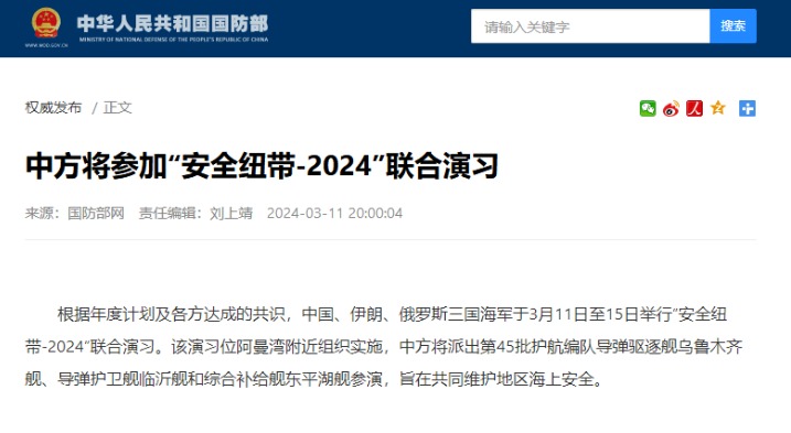 中國海軍艦艇編隊抵達恰巴哈爾港附近海域 圖源:“人民海軍”微信公眾號 伊朗半官方的通訊社塔斯尼姆(Tasnim)當地時間9日報道,演習“將於11日在伊朗東南部阿曼灣的恰巴哈爾港開始”,旨在“加強該地區的安全,擴大參與國之間的多邊合作”,但沒有具體說明演習持續時間。 報道又稱,“中國和俄羅斯海軍的軍艦、戰鬥艦與支援艦,以及伊朗海軍和革命衛隊的軍艦”預計將參加演習。 俄羅斯國防部同日發聲明說,莫斯科將派出兩艘護衛艦和一艘太平洋艦隊參加演習。“在印度洋北部的幾天裡,船員們將執行解救被俘船隻、海上搜救,以及向海上和空中目標進行炮擊的任務。” 中國國防部官方微信9日發文說,“中方將派出第47批護航編隊驅逐艦包頭艦、綜合補給艦高郵湖艦參演”。 此外,阿塞拜疆、南非、阿曼、哈薩克斯坦、巴基斯坦、卡塔爾、伊拉克、阿拉伯聯合酋長國和斯里蘭卡將作為觀察員出席演習。 伊朗軍隊於2月在同一地區進行演習,以“加強對任何威脅的防禦能力”。(完) 【編輯:彭玉婷】