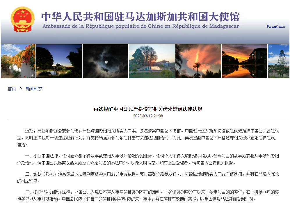 中國駐馬達加斯加使館官網截圖 其中包括,第一,根據中國法律,任何婚介都不得從事或變相從事涉外婚姻介紹業務,任何個人不得採取欺騙手段或以營利為目的從事或變相從事涉外婚姻介紹活動。請中國公民遠離以熟人或朋友介紹為名的不法中介,以免人財兩空。如有上當受騙者,請向中國國內公安機關報警。第二,金錢(彩禮)通常是當地法院判定販賣人口罪的重要依據。支付高額介紹費或彩禮,可能因涉嫌販賣人口罪而被逮捕,並將在馬陷入冗長的司法程序。第三,根據馬法律,外國公民入境後不得從事與簽證類別不符的活動。馬簽證類別中沒有以來馬娶親為目的的簽證,在馬機場辦理的落地簽只能從事旅遊活動。中國公民應了解自己的簽證種類和對應的來馬事由,並在簽證有效期內離境,以免因違反馬法律而受到懲罰。 馬達加斯加位於非洲大陸以東、印度洋西部,是非洲第一大、世界第四大島。馬係最不發達國家。(完) 【編輯:彭玉婷】
