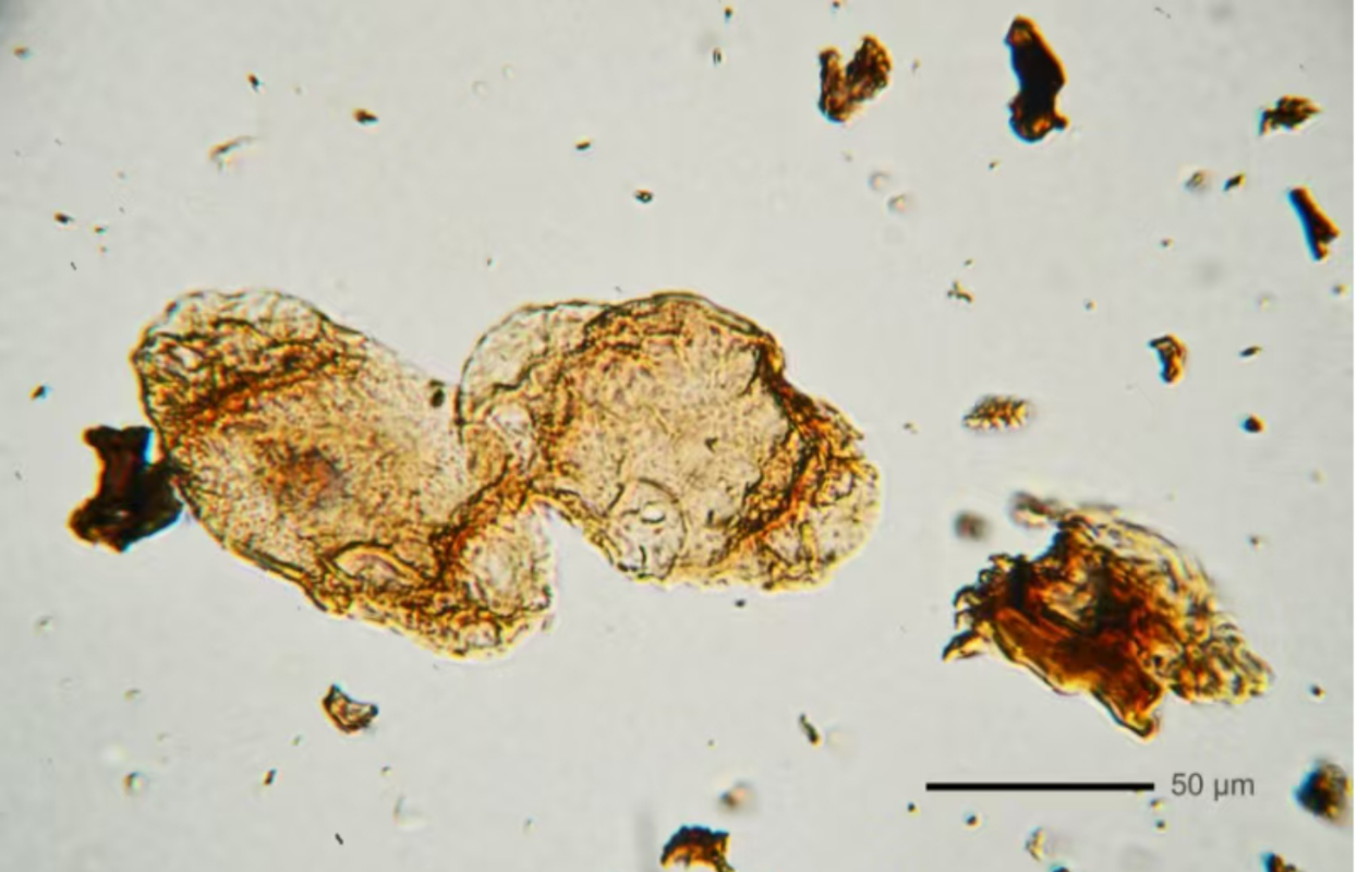 新疆南桃東溝剖面二叠紀末大滅絕開始時期的地層中發現的裸子植物或種子蕨類的雙氣囊花粉。圖源:中國科學院南京地質古生物研究所 據報道,自2019年開始,中國科學院南京地質古生物研究所博士彭輝平在研究員劉鋒的指導下,與中國科學院南京地質古生物研究所研究員萬明禮、美國密蘇里科技大學教授楊晚以及中國科學院古脊椎動物與古人類研究所研究員劉俊合作,對中國新疆吐哈盆地西緣出露的南桃東溝剖面中產出的孢粉化石進行了詳細研究。 科研團隊在南桃東溝剖面發現大量孢粉化石,經過與同層原位保存的、具有複雜根系結構的鬆柏類樹幹化石和蕨類莖秆化石對比,確定了這些孢粉化石的“身份”——不是再沉積的產物,而是產自當地植被,且未發生遠距離的位移。 確定為“本地土著”後,科研人員對南桃東溝二叠紀末大滅絕前後地層中保存的孢粉化石進行了屬種多樣性統計,發現已發現的33個孢粉屬在經過二叠紀末大滅絕後都得以幸存。若將世界其他地區的孢粉數據納入考慮,南桃東溝剖面記錄的孢粉化石種在大滅絕後真正滅絕的可能僅為21%。一系列證據表明,新疆吐哈盆地南桃東溝地區在二叠紀大滅絕期間并未出現明顯的陸地植被大滅絕現象。