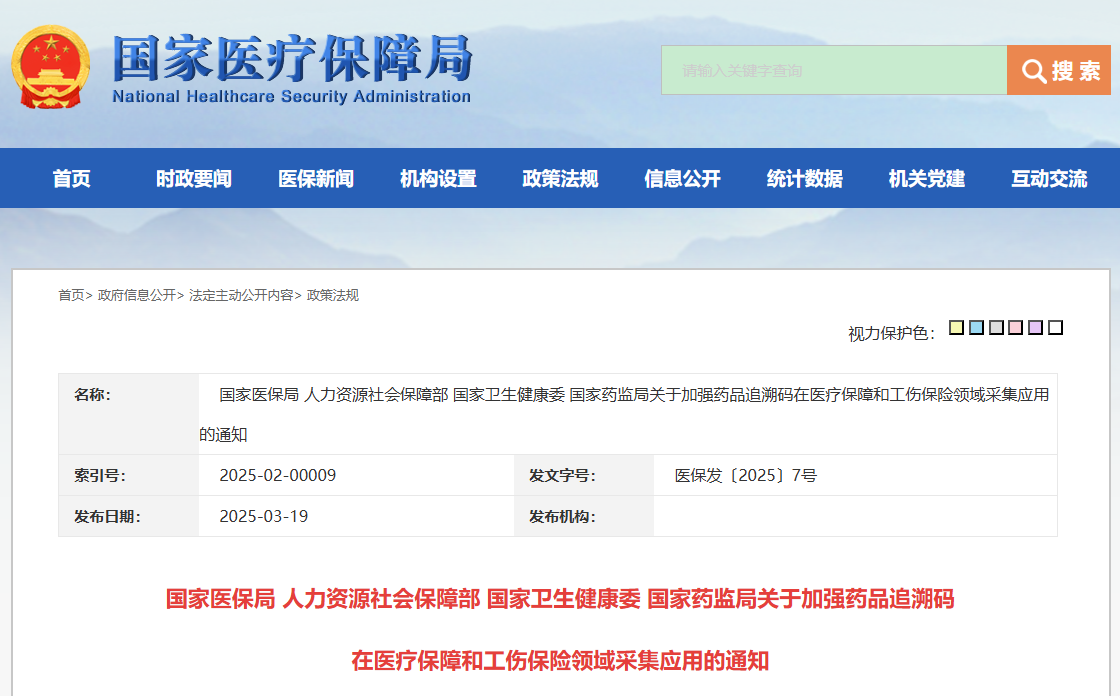 圖源:國家醫保局官網截圖 其中提出,依託全國統一的醫保信息平台和藥品上市許可持有人的藥品追溯系統,積極推動藥品全品種生產流通使用過程追溯和藥品追溯碼在醫療保障和工傷保險領域的全流程、全量采集和全場景應用,并逐步實現全部醫藥機構藥品追溯碼采集應用全覆蓋。