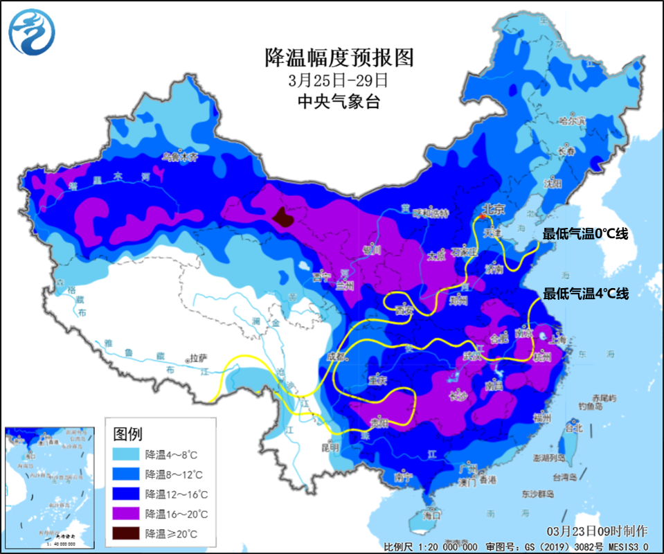 香港中通社3月23日電 據中央氣象台消息,預計3月25日至29日,寒潮天氣將自西向東影響中國除青藏高原外的大部地區,其中:25日至26日主要影響西北地區、華北西部,27日至29日將影響中東部大部地區。此次寒潮影響範圍廣、降溫劇烈,北方將出現大範圍大風沙塵天氣,淮河以南局部地區將出現強對流天氣,但雨雪強度明顯弱於今年3月1日至3日寒潮過程。