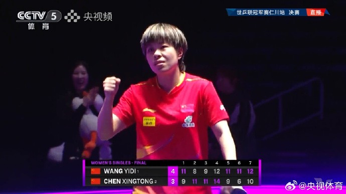 王藝迪獲女單冠軍 圖源:央視體育 根據賽制,冠軍賽只設置男、女單打項目,比賽前幾輪為5局3勝制,四分之一決賽開始為7局4勝制。 女單半決賽中,王藝迪和陳幸同分別以4:1、4:2戰勝中國澳門隊選手朱雨玲和日本選手張本美和,會師決賽。兩人鏖戰六局後,王藝迪以12:10拿下最後一城,4:3戰勝隊友問鼎。 王藝迪賽後表示,在遭遇困難的情況下贏下比賽很不容易,也非常開心。“打到決勝局之後自己沒有預想結果,中間一度非常被動,只想著盡全力把比分往回追。”