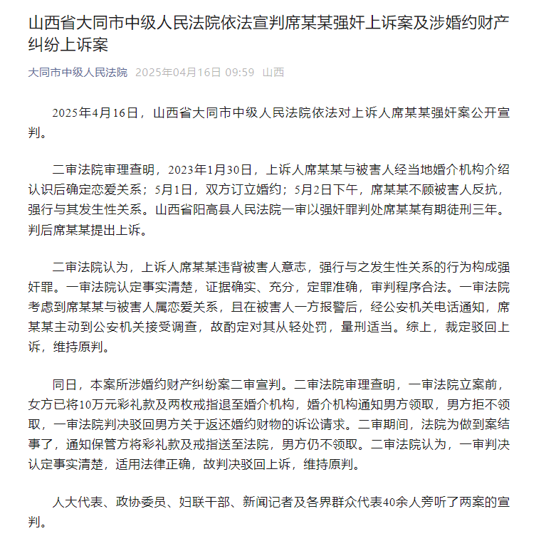 “大同市中級人民法院”微信公眾號截圖 二審法院審理查明,2023年1月30日,上訴人席某某與被害人經當地婚介機構介紹認識後確定戀愛關係;5月1日,雙方訂立婚約;5月2日下午,席某某不顧被害人反抗,強行與其發生性關係。山西省陽高縣人民法院一審以強奸罪判處席某某有期徒刑三年。判後席某某提出上訴。 二審法院認為,上訴人席某某違背被害人意志,強行與之發生性關係的行為構成強奸罪。一審法院認定事實清楚,證據確實、充分,定罪準確,審判程序合法。一審法院考慮到席某某與被害人屬戀愛關係,且在被害人一方報警後,經公安機關電話通知,席某某主動到公安機關接受調查,故酌定對其從輕處罰,量刑適當。綜上,裁定駁回上訴,維持原判。 同日,本案所涉婚約財產糾紛案二審宣判。二審法院審理查明,一審法院立案前,女方已將10萬元彩禮款及兩枚戒指退至婚介機構,婚介機構通知男方領取,男方拒不領取,一審法院判決駁回男方關於返還婚約財物的訴訟請求。二審期間,法院為做到案結事了,通知保管方將彩禮款及戒指送至法院,男方仍不領取。二審法院認為,一審判決認定事實清楚,適用法律正確,故判決駁回上訴,維持原判。 人大代表、政協委員、婦聯幹部、新聞記者及各界群眾代表40餘人旁聽了兩案的宣判。(完) 【編輯:彭玉婷】