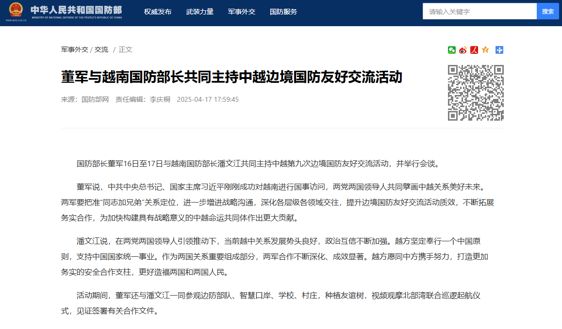 香港中通社4月17日電 中國國防部長董軍16日至17日與越南國防部長潘文江共同主持中越第九次邊境國防友好交流活動,並舉行會談。