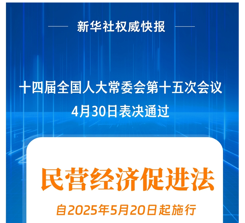香港新聞網4月30日電 十四屆全國人大常委會第十五次會議今日表決通過中國民營經濟促進法,自2025年5月20日起施行。據新華社消息,民營經濟促進法共9章78條,包括總則、公平競爭、投資融資促進、科技創新、規範經營、服務保障、權益保護、法律責任和附則。