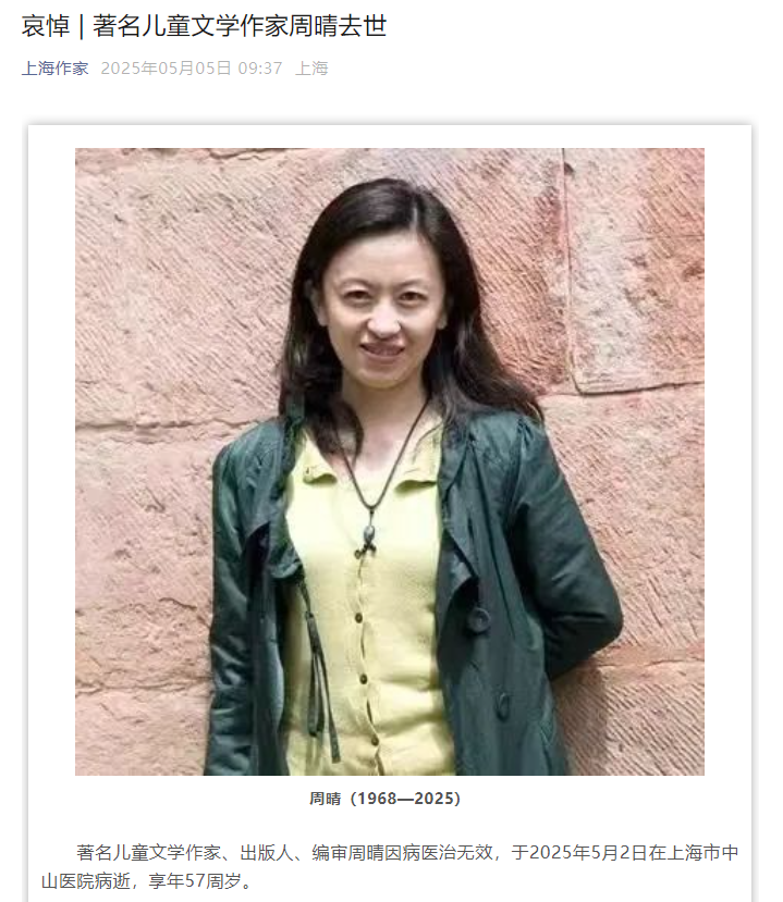香港中通社5月5日電 上海市作家協會5月5日發布訃告:著名兒童文學作家、出版人、編審周晴因病醫治無效,於2日在上海市中山醫院病逝,享年57周歲。
