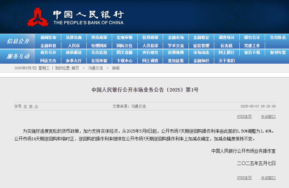 香港新聞網5月7日電 中國人民銀行(央行)5月7日公告稱,為實施好適度寬鬆的貨幣政策,加力支持實體經濟,從2025年5月8日起,公開市場7天期逆回購操作利率由此前的1.50%調整為1.40%。 公開市場14天期逆回購和臨時正、逆回購的操作利率繼續在公開市場7天期逆回購操作利率上加減點確定,加減點幅度保持不變。