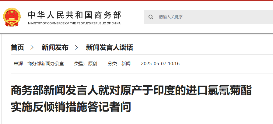 中國商務部網站截圖 商務部新聞發言人表示,應中國國內產業申請,2024年5月7日,商務部依法對原產於印度的進口氯氰菊酯發起反傾銷調查。在案件調查過程中,商務部嚴格按照法律法規和世貿組織相關規則進行調查,廣泛聽取了各利害關係方意見,充分保障各方權利,客觀、公平、公正地得出調查結論,裁定自印度進口的氯氰菊酯存在嚴重傾銷,中國國內產業受到實質損害,且傾銷與實質損害之間存在因果關係,各印度公司被裁定的反傾銷稅率為48.4%至166.2%。商務部決定自2025年5月7日起實施反傾銷措施,期限5年。