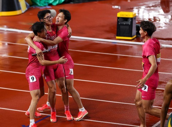 5月10日,中國隊選手在男子4X400米接力預賽後慶祝。新華社圖片 當晚,男子4X400米接力預賽開始,中國隊在第一小組。發令槍響,第一棒梁寶棠如離弦之箭衝出,這一棒他跑出45秒50,讓中國隊在交接棒後取得領先。第二棒李懿卿和第三棒張起寧之後,中國隊雖然掉到了第三位,但並沒有被第二名西班牙隊拉開太大差距。第四棒付浩然在最後200米反超西班牙隊,最終中國隊以小組第二晉級決賽。3分1秒87的成績比此前3分3秒47的全國紀錄快了將近2秒。 另外,10日的混合4x100米接力預賽中,由黃淑萍、孔玲瑤、陳錦豐和陳冠鋒組成的中國隊跑出41秒30,位列小組第三,最終憑藉總排名第八位晉級11日舉行的決賽。 本次賽事是東京田徑世錦賽的重要資格賽,每個項目有14支代表隊將獲得世錦賽資格。當晚,美國隊在4X400米混合接力中跑出3分11秒37的今年世界最好成績;男子4X100米接力中,南非隊和日本隊都跑出了37秒84的今年世界最好成績。(完) 【編輯:彭玉婷】