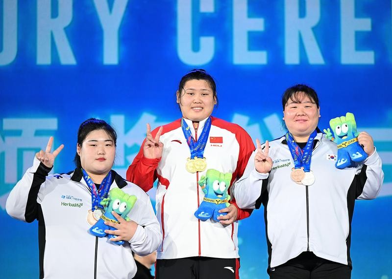 5月15日,總成績冠軍中國選手李閆(中)、亞軍韓國選手樸惠正(左)和季軍韓國選手孫永熙在頒獎儀式上合影。圖片來源:新華社 據新華社報道,在女子87公斤以上級比賽中,曾獲杭州亞運會冠軍、巴黎奧運會亞軍的韓國選手樸惠正等好手出戰,中國隊派出世錦賽冠軍李閆。“大家成績好像差不多,但是我感覺我比她們厲害一點。”李閆說。 李閆的自信建立在實力之上。抓舉階段她最後出場,第一次試舉就鎖定金牌。她的抓舉最終成績為140公斤,超第二名樸惠正15公斤。樸惠正的隊友孫永熙獲得抓舉銅牌。