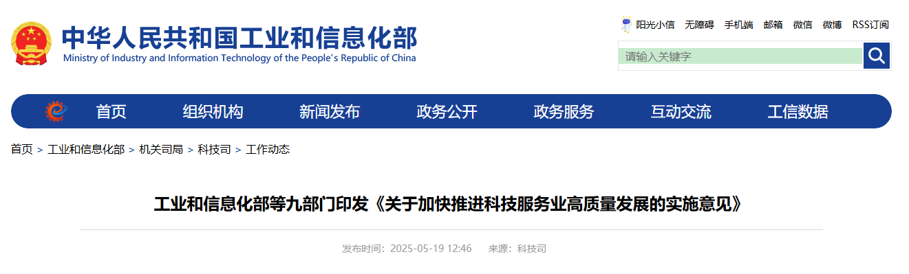 中國工信部網頁截圖 據新華社報道,科技服務業是連接科技創新與市場需求的重要橋樑。實施意見提出,要推動科技服務業全面發展,圍繞研究開發、技術轉移轉化、企業孵化、技術推廣等重點領域進行全面部署,明確發展任務。要加快轉型升級,強化科技服務創新,深化新一代信息技術融合應用,推廣應用先進綠色技術,促進與三次產業深度融合,推動科技服務業高端化、智能化、綠色化、融合化發展。