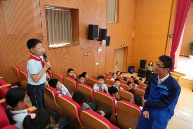 現場李森、趙靈遠兩位總經理部高級工程師用通俗易懂的語言為孩子們講解風力發電的原理,以及港口形成所帶來的貨物運輸便利。接著又已臨港風電和洋山深水港建設為例,讓學生們了解到港口建成的過程以及風電技術在近些年不斷進步的過程。為了讓學生們有更直觀的感受,兩位工程師們還特意準備了風電設備模型,用最直觀的方式讓孩子們知道了風力發電機將風能轉化為機械能最終再轉化為電能的過程。同時,介紹了目前正在建設的小洋山北側西防波堤項目正在使用的桶式基礎結構。 課堂互動環節,同學們紛紛化身“好奇寶寶”,“風力發電機時間久了會生銹嗎?”“桶那麼大怎麼運輸呀?”“如果遇見大風在海上作業危險嗎?”兩位工程師耐心的為同學們一一講解,生動的為大家描述風力發電機從安裝到後期維護的過程,以及目前新型桶式基礎結構的運輸安裝流程。最後,通過兩段風力發電機和桶式基礎結構安裝的視頻讓同學們直觀的感受到基建的魅力。同學們驚嘆就在臨港一側的東海屹立的那些“大傢夥們”是通過一代代科技創新的更迭做到的。