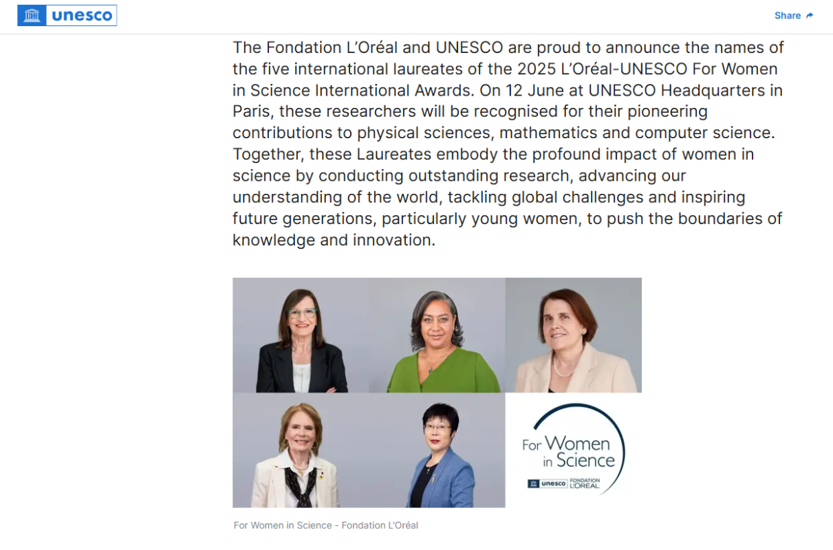聯合國教科文組織網站截圖 公報說,清華大學高等研究院“楊振寧講座”教授王小雲為安全的數據通信和存儲提供了堅實保障。她的突破性研究揭示了被廣泛應用於通信協議的哈希函數所存在的根本性漏洞,推動了新一代哈希函數標準的制定。如今,這些標準廣泛應用於銀行卡、計算機密碼與電子商務領域。