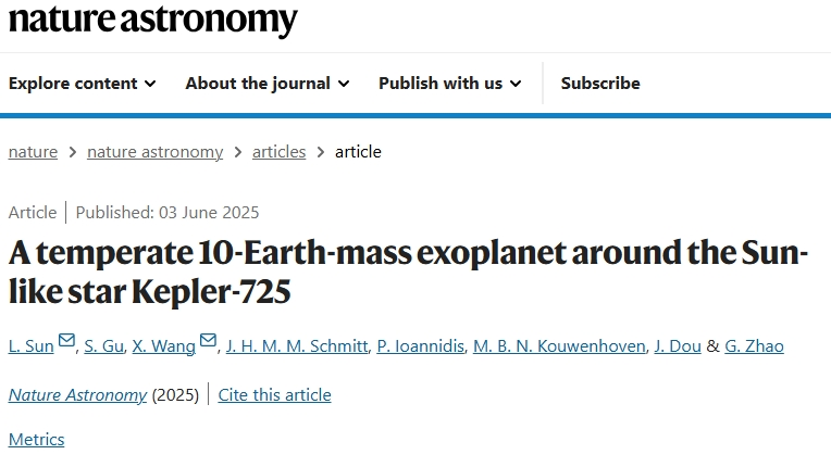 Nature Astronomy網站截圖 這顆“超級地球”圍繞一顆名為Kepler-725的G9V型宿主恆星運行。該宿主恆星的光譜型與太陽相似,但它比太陽年輕,年齡僅為16億年,表面的磁場活動要比太陽活動更為劇烈。該“超級地球”位於Kepler-725的宜居帶——一個適合液態水存在的區域,被認為是類地生命誕生的關鍵條件。它繞宿主恆星運行一圈大約需要207.5天,與地球的公轉周期相近。 “‘超級地球’在一個像太陽一樣的恆星附近的宜居帶裡,也就是說它有可能存在類似於地球上的碳基生命。”中國科學院雲南天文台研究員顧盛宏介紹,“它離我們有將近1.6億個地球到太陽之間的距離這麼遠。” 這項研究由中國科學院雲南天文台、德國漢堡天文台、西交利物浦大學和中國科學院南京天文光學技術研究所組成的國際聯合研究團隊,首次利用“凌星中間時刻變化”(Transit Timing Variation, 即TTV)技術完成。中國科學院雲南天文台孫磊磊博士為論文第一作者和共同通訊作者,王曉彬研究員為論文共同通訊作者。 該工作受到多位審稿人的高度評價,認為其開闢了發現類太陽恆星宜居帶內“第二個地球”的新通道。(完) 【編輯:淩玉輝】